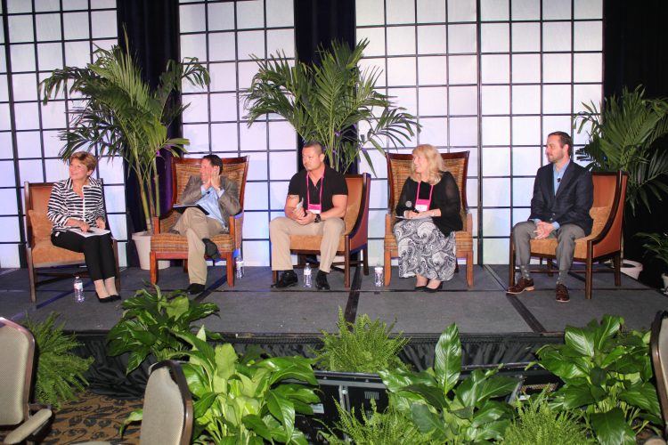 Barb Pellow (far left) led a panel at the 2018 Inkjet Summit featuring, from the left, Brett Coltman, Direct Technologies; Martin Aalsma, King Printing; Marianne Gaige, Cathedral Corp.; and Adam LeFebvre, Specialty Print Communications (SPC).