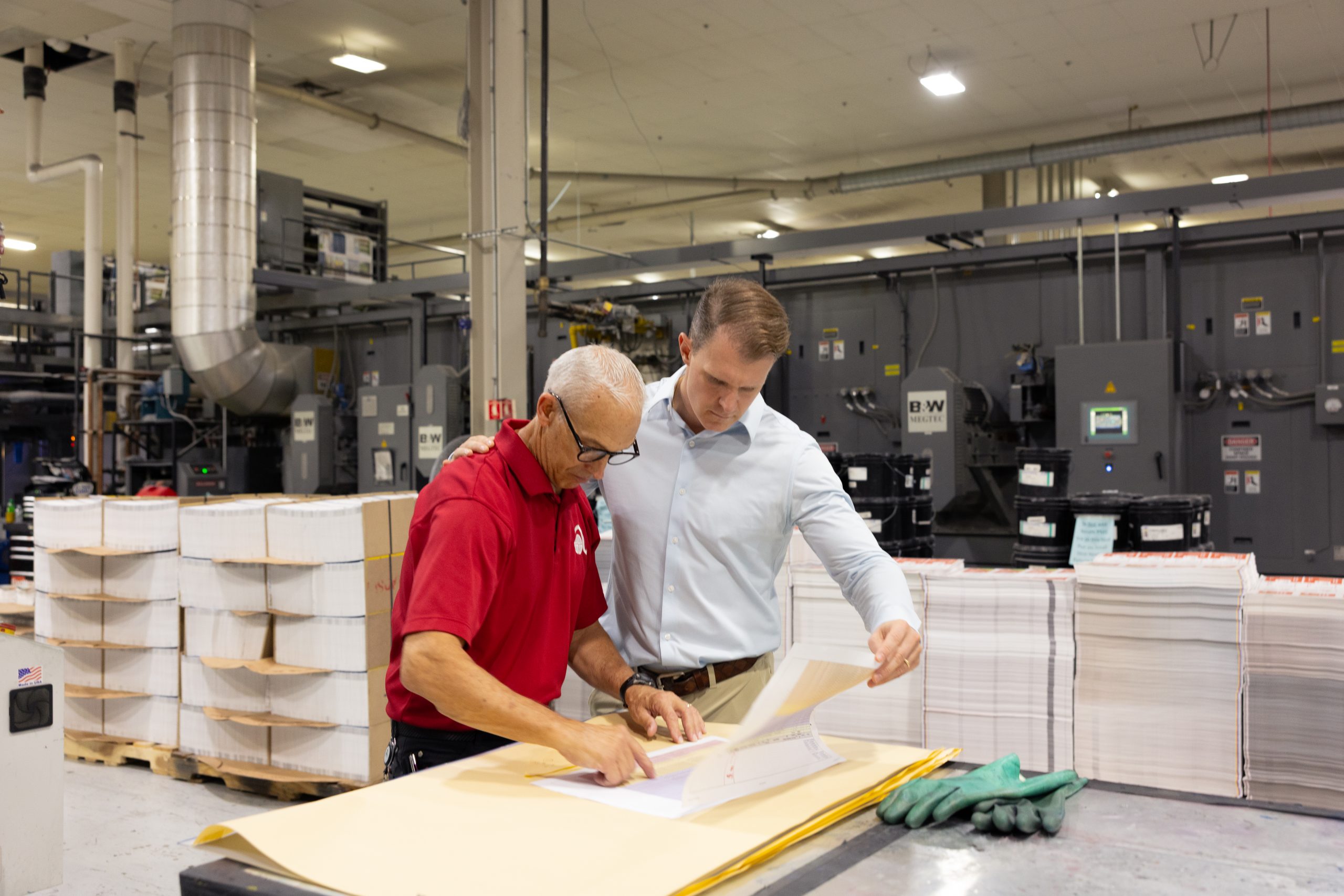 (From Left) Kyle Howard, web supervisor, and John Sommers, president, look over paperwork on Allied’s production floor.