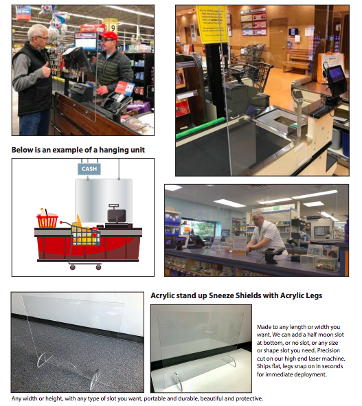 We can make any size Acrylic or Polycarbonate Sneeze guards that are for countertop use, screwed directly to counter areas, or hanging. Laser cut with safe round corners and pass through slots, if needed.