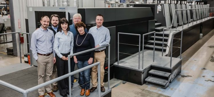 Partners Brad Flagge (from the left), Nick Bova and Craig Inglish have added packaging to the menu of product offerings at Push Solutions with the help of a pair of UV-LED equipped RMGT 9 Series sheetfed offset presses.