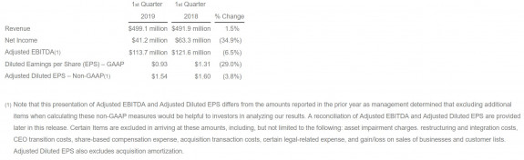 Deluxe Corporation, a trusted, technology-enabled solutions provider, announced its financial results for the first quarter ended March 31, 2019. Revenue was within the Company’s previously disclosed outlook range of $490 to $505 million. Adjusted diluted EPS, calculated consistently with our prior year methodology, was $1.14, compared to the outlook range of $1.05 to $1.15.