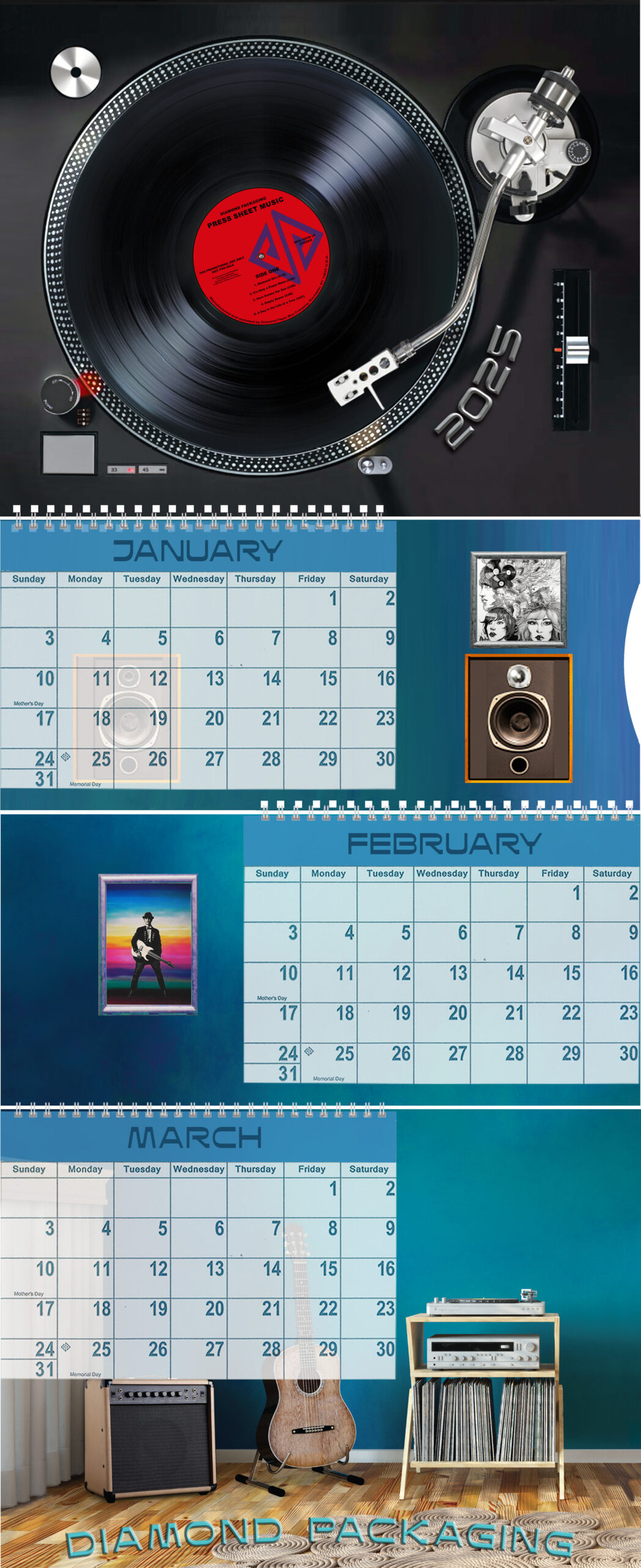 Tightly-registered coatings were used to enhance the design and highlight the individual calendar components. UV matte coating was used on the wall. UV gloss coating was used on all four vinyl records, turntable (tonearm, controls), frames, stereo rack, and Diamond Packaging text. Reticulated specialty coating was applied to the turntable plinth and guitar amplifier to create texture and haptic feedback. The record grooves feature MotionCoat specialty UV coating, supplied by ACTEGA, that creates dramatic, motion-like visual effects.