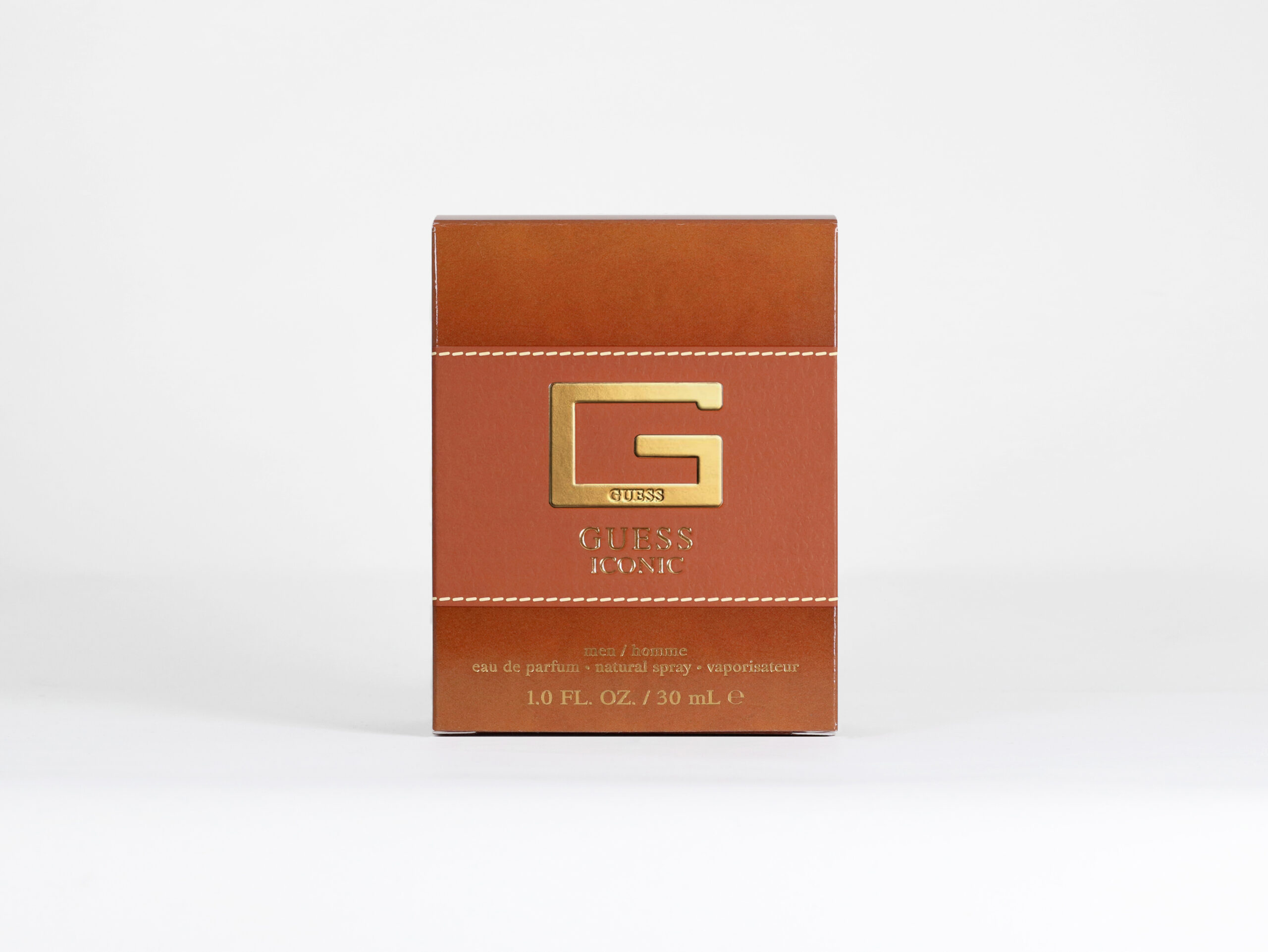The design features soft brown gradients highlighted by a multi-level embossed leather-style band that wraps around the carton. Detailed stitching and a smooth, soft-touch coating enhance the band’s visual appeal and tactile realism. This distinctive element creates a striking contrast to the surrounding high-gloss finish. A gold foil embossed and debossed GUESS Iconic logo enhances the design and adds additional dimension to the overall presentation.