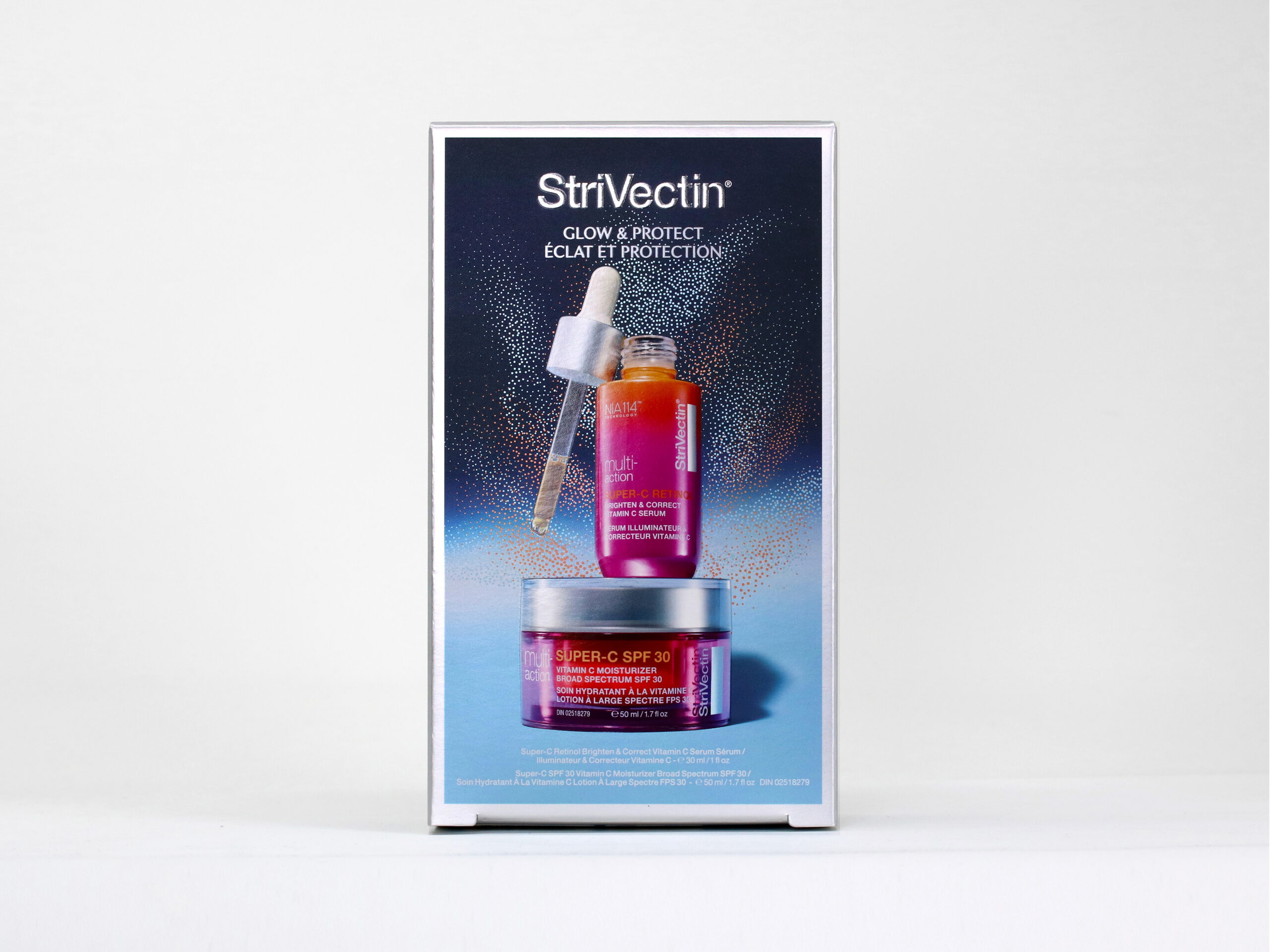 Overprinting PMS colors over silver cold foil differentiates the collection, adds distinction, and reinforces StriVectin as a prestige skincare brand. The overall soft touch matte coating adds an appealing tactile quality that promotes consumer interaction, and provides a striking contrast to the UV gloss spot coating applied over the product photos. Embossed logos on the front, top, and side panels add depth and dimension to the design.