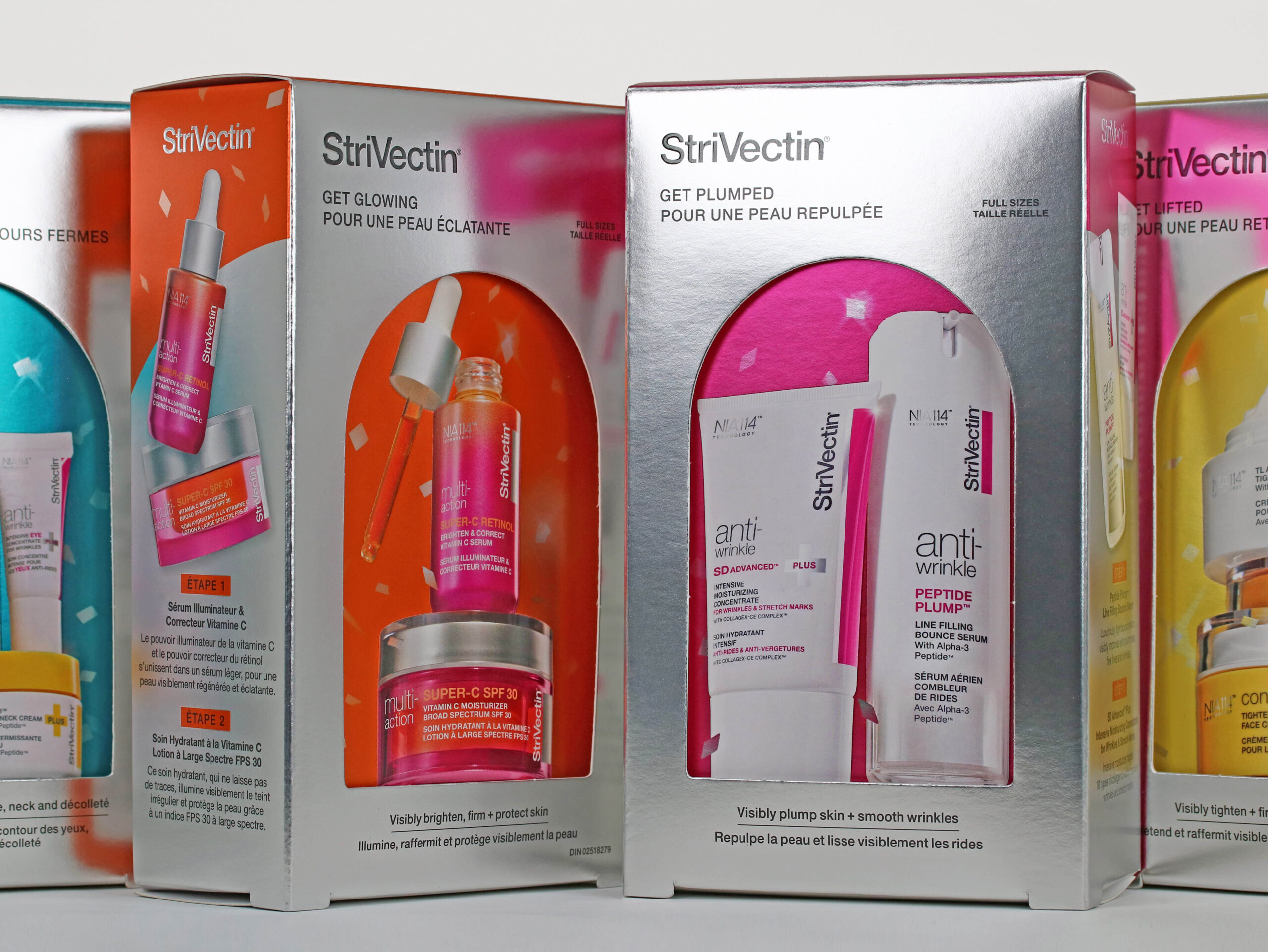 Overprinting PMS colors over silver cold foil differentiates all four (4) gift sets, adds distinction, and reinforces StriVectin as a prestige skincare brand. The overall matte coating provides a striking contrast to the UV gloss spot coating applied over the product photos.