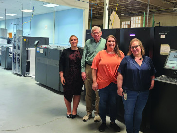 PrintMail Solutions executives, standing from the left, include: Gretchen Renaud, vice president of strategic partnerships; Steven King, operations director; Amy Dane, operations manager; and Kelly Wolak, print supervisor. | Credit: PrintMail Solutions