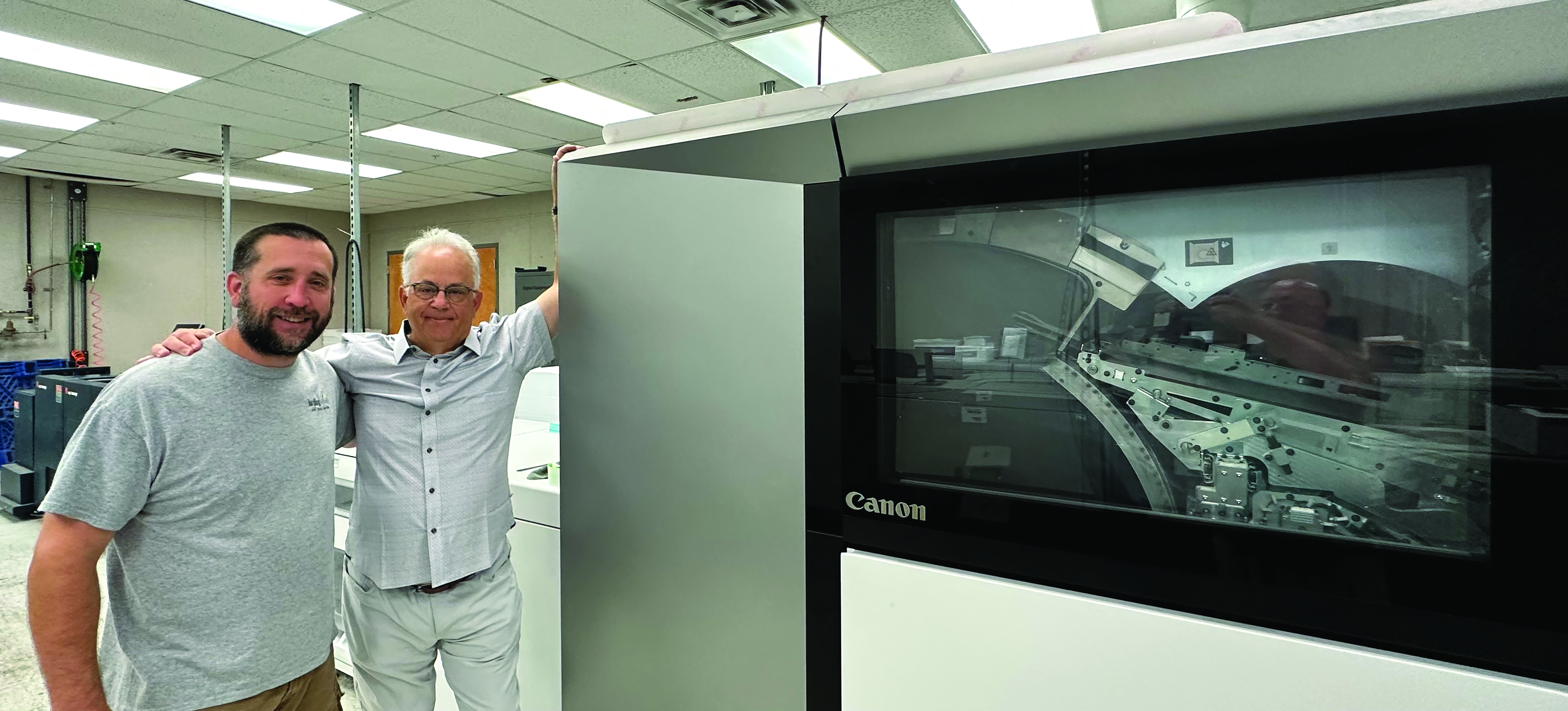 David Harding, chairman and CEO of HardingPoorman (right), stands with Lance McCoskey, digital team lead, with the company’s Canon varioPRINT iX series sheetfed press.| Credit: