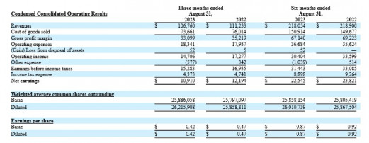 The Company’s revenues for the second quarter ended August 31, 2023 were $106.8 million compared to $111.2 million for the same quarter last year, a decrease of $4.4 million, or 4.0%. Gross profit margin was $33.1 million, or 31.0%, as compared to $35.2 million, or 31.7%, for the same quarter last year. Net earnings for the quarter were $10.9 million, or $0.42 per diluted share, as compared to $12.2 million, or $0.47 per diluted share for the same quarter last year.