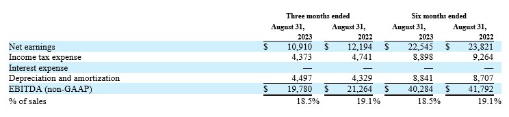 The following table reconciles EBITDA, a non-GAAP financial measure, for the three and six months ended August 31, 2023 to the most comparable GAAP measure, net earnings (dollars in thousands).