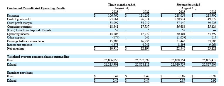 The Company’s revenues for the six-month period ended August 31, 2023 were $218.1 million compared to $218.9 million for the same period last year, a decrease of $0.8 million or 0.4%. Gross profit margin was $67.1 million, or 30.8%, as compared to $69.2 million, or 31.6% for the six-month periods ended August 31, 2023 and August 31, 2022, respectively. Net earnings for the six-month period ended August 31, 2023 were $22.5 million, or $0.87 per diluted share compared to $23.8 million, or $0.92 per diluted share for the same period last year.
