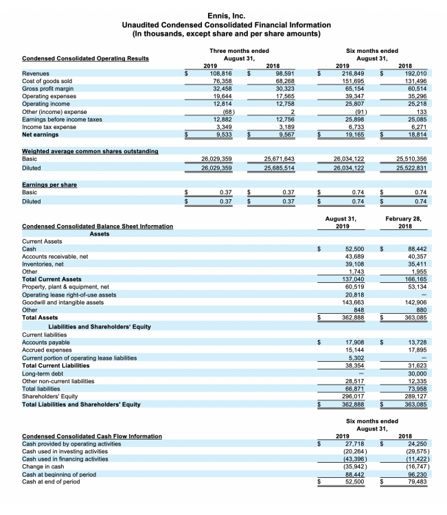 Ennis, Inc., has reported its financial results for the three and six months ended Aug. 31, 2019. Highlights include: