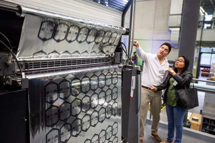 The machine for the customer Prof Press – a Speedmaster XL 106 eight-color press with coating unit – was now presented for the first time at the Label Day. It is precisely tailored to the requirements of the printing company and equipped with the new FoilStar Cure, the CutStar roll sheeter, and three LED UV interdeck dryers. The visitors to the Label Day were impressed by the high quality of the results. Another factor in this were the Saphira consumables optimally matched to the process and the machine. The printing press was incorporated into a production workflow with the Speedmaster XL 106-DD rotary die-cutter. The die-cut labels were then finished using the TRX 1100 blank separator from Kawahara.