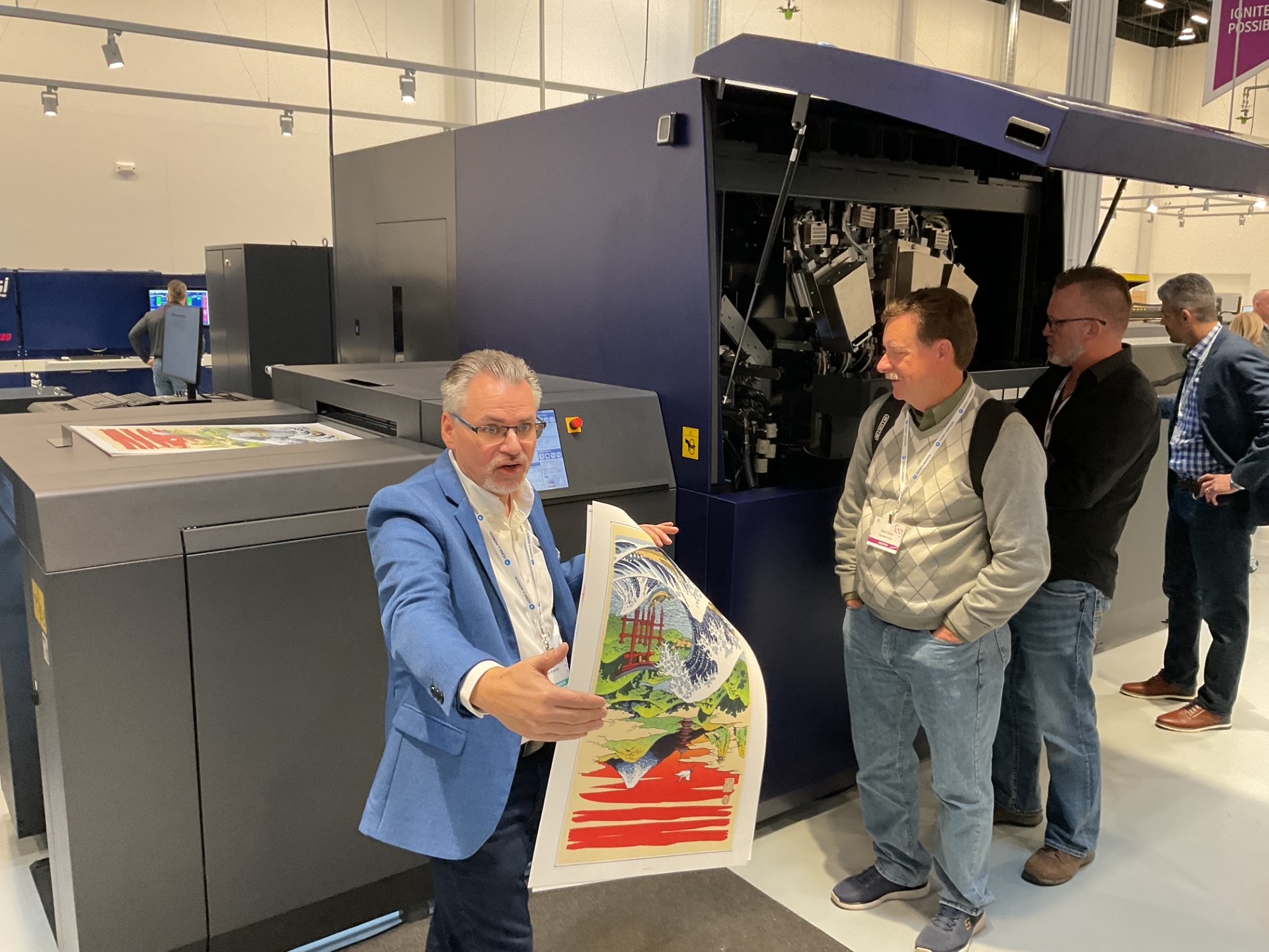 In the CEC, attendees crowded around the AccurioJet 30000 UV inkjet press to hear about the advanced technologies it employes. Its new Generation 4 inkjet heads have heaters across the heads, an innovation that allows for more even printing, said Bret Riecke, vice president of Industrial Print Solutions.