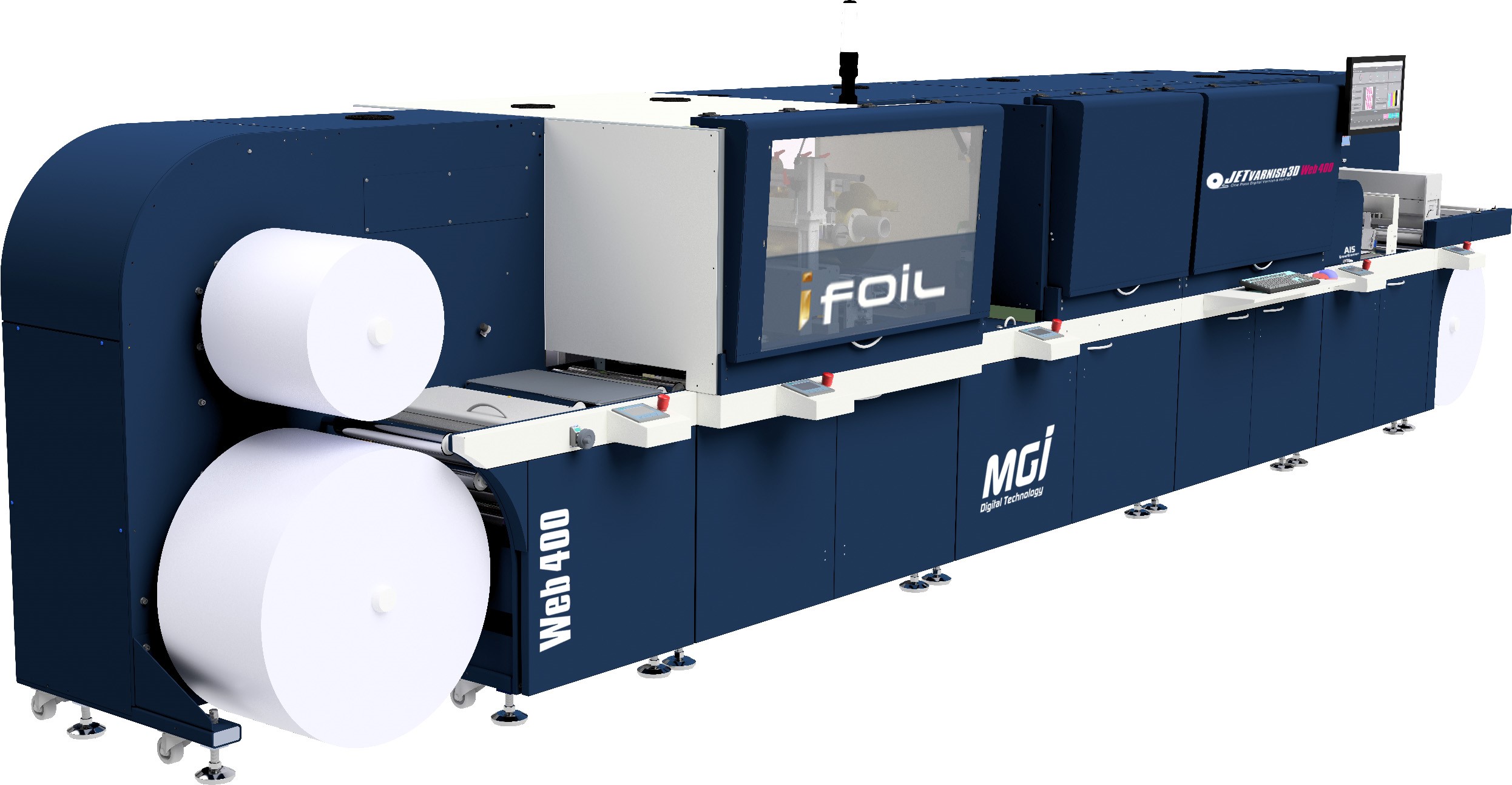 Konica Minolta's JETvarnish 3D Web 400 is the only single-pass spot-UV and hot foil embellishment reel-to-reel system available in the market.