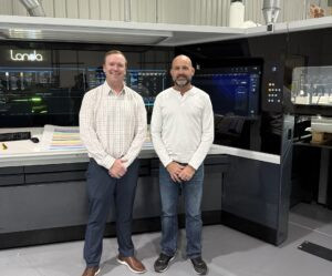 Pictured from left are Marketing Alliance Group’s (MAG) Landon Hair, COO, and Jamie Dotson, general manager, with the company’s new Landa S11 Nanographic Printing press.