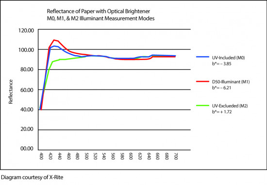 - The amount of UV emitted by the instrument used to read color can vary with different instruments, delivering varying results from OBA-brightened papers. This makes it more difficult to deliver consistency.