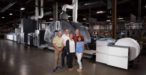 Standing with their HP PageWide T250 HD inkjet web press, from the left, are Chris Feryn, president; Manuel Saez, VP; Juli Cordill, CMO/managing director; Scott Gorman, VP; and Lisa Held, CFO.
