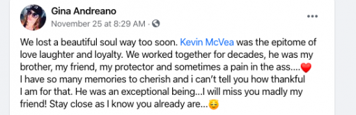 Former HudsonYards President Diane Romano posted on Facebook after hearing the news of Kevin's passing.