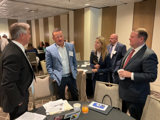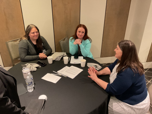 Sara Deneau and Jennifer Pettinger of Sun Print Solutions talk with Adriane Harrison, vice president of Human Relations Consulting at PRINTING United Alliance during the inaugural Legislative Fly-In.