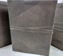 The seven-person franchise printer was tasked with producing eight copies of three different menus in about two weeks for Outback Steakhouse: a hardcover paperboard book with interior soft-touch coatings and custom diecut pages meant to look like Outback Steakhouse’s signature appetizer — the Bloomin’ Onion; a multipage expedition journal booklet with a faux leather cover featuring a printed logo; and a stepped-page menu on reclaimed board with a leather-like cover flap.