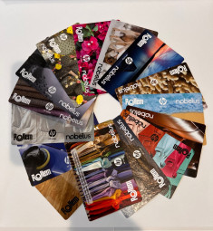 Vibrant, Nine-up postcard sheets are printed on an HP Indigo press then laminated on the Komfi laminator with one of five specialty Tactile Collection films by Nobelus. Sheets are then converted on the Insignia into individual 5 ½ x 3 ½” round cornered postcards. These colorful, shaped, cards with coordinating tactile coatings engage the recipient with their enhanced visual and tactile effects.