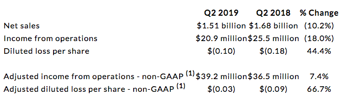 Loss per share attributable to common stockholders was ($0.10) in the second quarter of 2019, compared to diluted loss per share of ($0.18) in the second quarter of 2018. Non-GAAP adjusted diluted loss per share attributable to common stockholders of ($0.03) in 2019 improved from ($0.09) in 2018. The improvement was primarily driven by lower interest expense and higher adjusted income from operations partially offset by higher tax expense, which included a $3.4 million charge related to withholding taxes associated with the repatriation of foreign cash to the U.S.