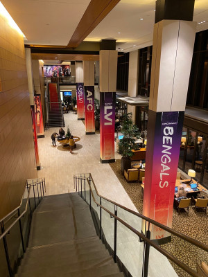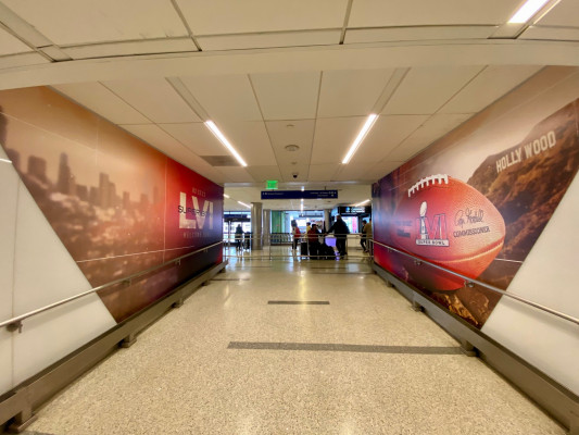 bluemedia’s EVP and partner, RJ Orr, sat down to talk with Wide-format Impressions about everything that went into this year’s project. Like in past years, he notes, it encompassed not just the stadium itself, but a variety of venues across the city including the airport, both team hotels, the NFL Experience Center, the practice facilities for the teams, the media center, and more. In addition, he notes, the PSP worked with clients that touch the Super Bowl, such as Anheuser-Busch and Marriott Hotels.