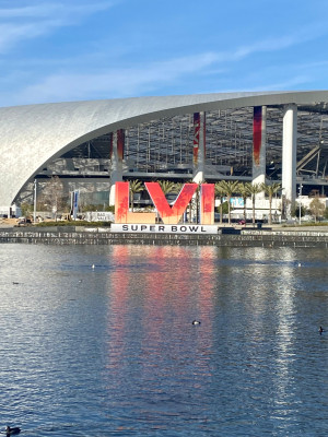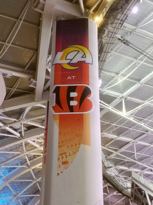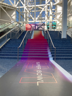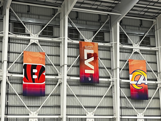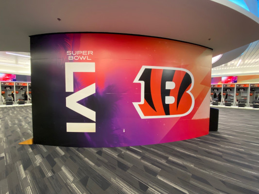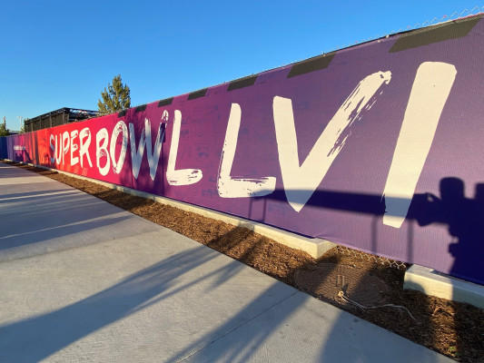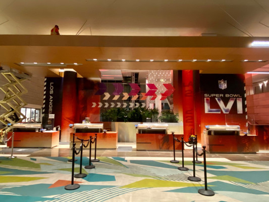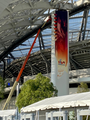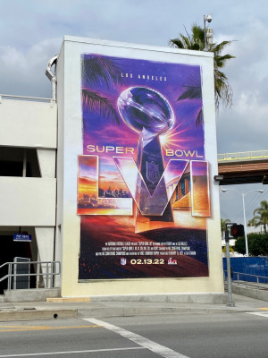 For the eighth year in a row, large-format print service provider bluemedia, based in Tempe, Arizona, took on the enormous challenge of producing and installing all of the graphics for the Super Bowl. This year’s game, Super Bowl LVI, was held in Los Angeles on February 13, and brought its own unique challenges and opportunities for creative graphics.