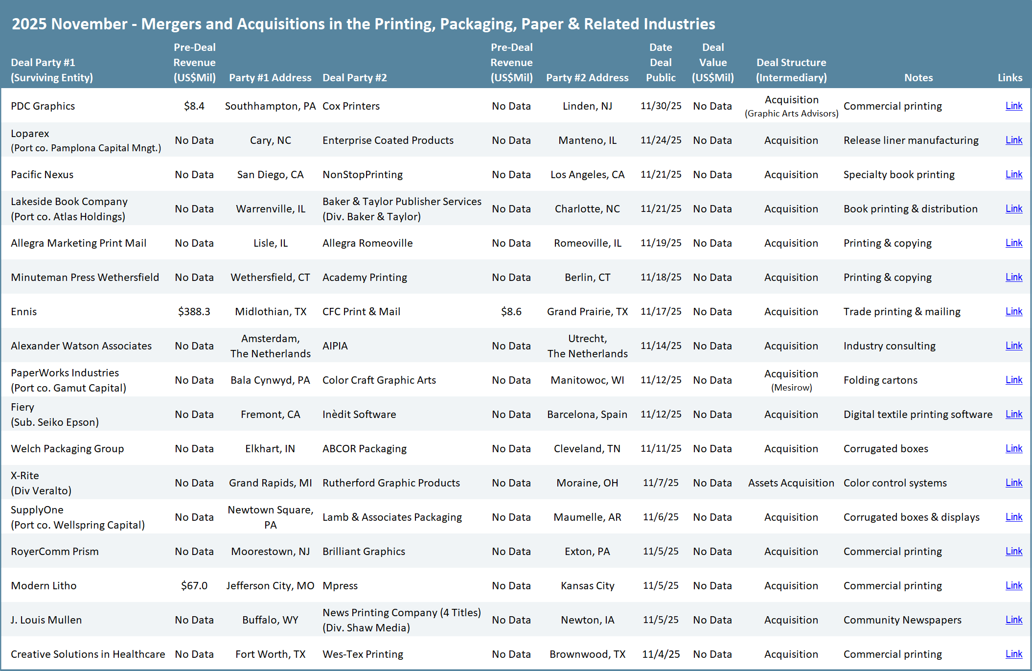 In a landscape shaped by overcapacity, shifting demand patterns, and rising competitive pressure, the transactions in November provide a clear signal: the future in print does not necessarily belong to the biggest portfolio but is more likely to benefit the most focused platform. As this latest cycle unfolds, the companies that define the next era of commercial print will be those that align acquisitions with a coherent strategic identity and/or geographic rationale, not those that chase scale for its own sake.