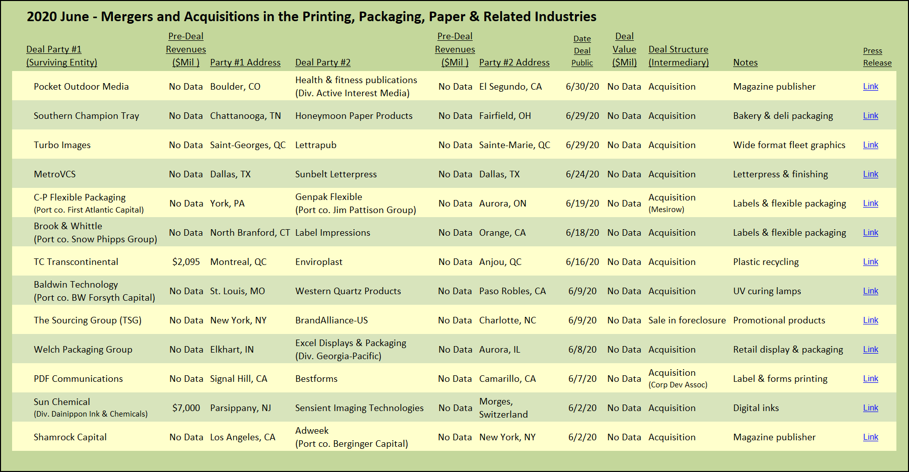 In our opinion, the June deals are a clear sign of a thaw in the market; deals that were frozen when the virus broke out are now closing. In addition to the transactions noted above, which were likely in process and closed only after a restart and sufficient due diligence, other acquisitions completed in June include Baldwin Technology’s purchase of Western Quartz Products, an established producer of UV lamps which are used to cure UV-cured inks, increasingly used in offset printing production. In another deal, also likely in process before the freeze-up, Sun Chemical absorbed Sensient Imaging Technologies, a supplier of digital printing inks used in the rapidly growing application of inkjet printing technology in packaging, commercial printing, book printing, direct mail and transactional print segments.