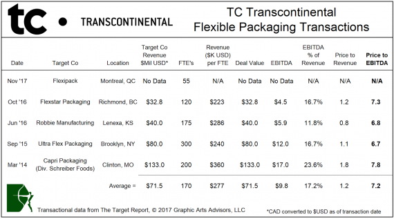 At the onset of this strategy in March 2014, when TC acquired its first flexible packaging company, François Olivier, president and CEO of TC, stated that the deal was the first indication of the company’s new strategic plan to grow through diversification. He added that flexible packaging was identified as a natural fit since the production process was in many ways similar to their current operations that ran roll-fed substrates and the market offered opportunities for growth. (see The Target Report – March 2014). Viewed from the perspective of its M&A activity, the company has remained laser-focused on implementing this strategy.