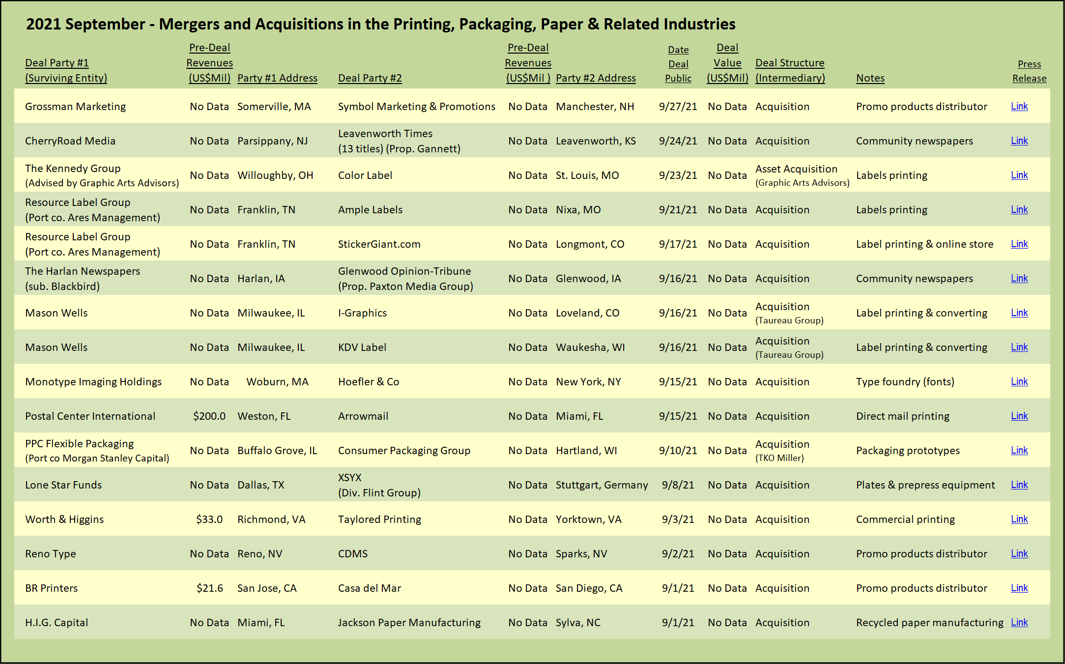 It’s a feeding frenzy in the prime label printing and converting business. Fueled by multiple private equity-backed roll-up platforms, the activity has been non-stop and does not appear to be ready to slow down until all the prime fruit has been picked.