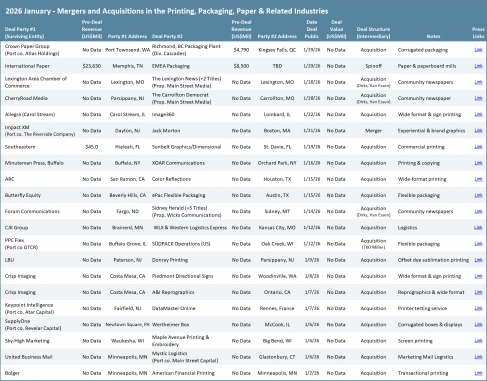 For much of the past decade and a half, discussions about mergers and acquisitions in the printing and packaging industries have been dominated by the steady drumbeat of label-printing deals, as often reported here in The Target Report. (See The Target Report: Duking it Out in the Label Business – February 2023). However, over the past several months, transactional activity in the label segment has slowed, and there have been rumblings that the overall label printing and converting businesses face increasing headwinds.