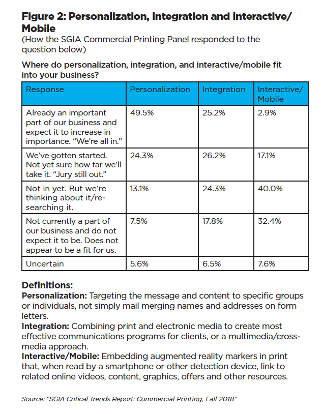 And then there’s what the “SGIA Critical Trends Report: Commercial Printing” describes as “thinking big and thinking carefully.” The big part is thinking beyond how print is manufactured to how print powers communication — particularly personalized, integrated, interactive/mobile communication. We asked our research panel where, if at all, the three fit in their plans. Among the responses, summarized in Figure 2: