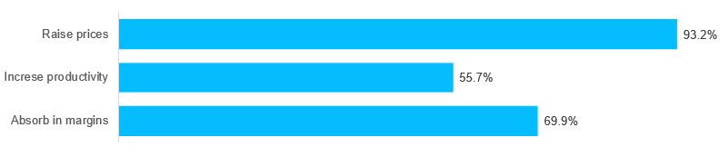 We also learned that 93.2% plan to raise prices in response to the tariffs, 55.7% to boost productivity, and 69.9% to absorb at least part of the increase to maintain market share (Figure 2). When we asked how much of the increase will be offset and how much will be absorbed, responses varied significantly from company to company but averaged 58.7% offset by raising prices, 17.7% offset by increasing productivity, and 23.6% absorbed.
