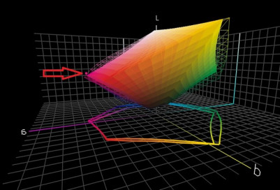 This second diagram shows the 3D rendering. The red arrow is showing the PANTONE color. The solid gamut is GRACoL 2013 and the wireframe is the CMYK+Orange inkjet printer gamut. The color we are trying to match is right on the edge of the gamut, and I suspect would be acceptable to most print buyers. To learn more about matching spot or PANTONE colors, check out the Spot Color Management for Digital Printing course on our iLEARNING+ platform at ilearningplus.org.
