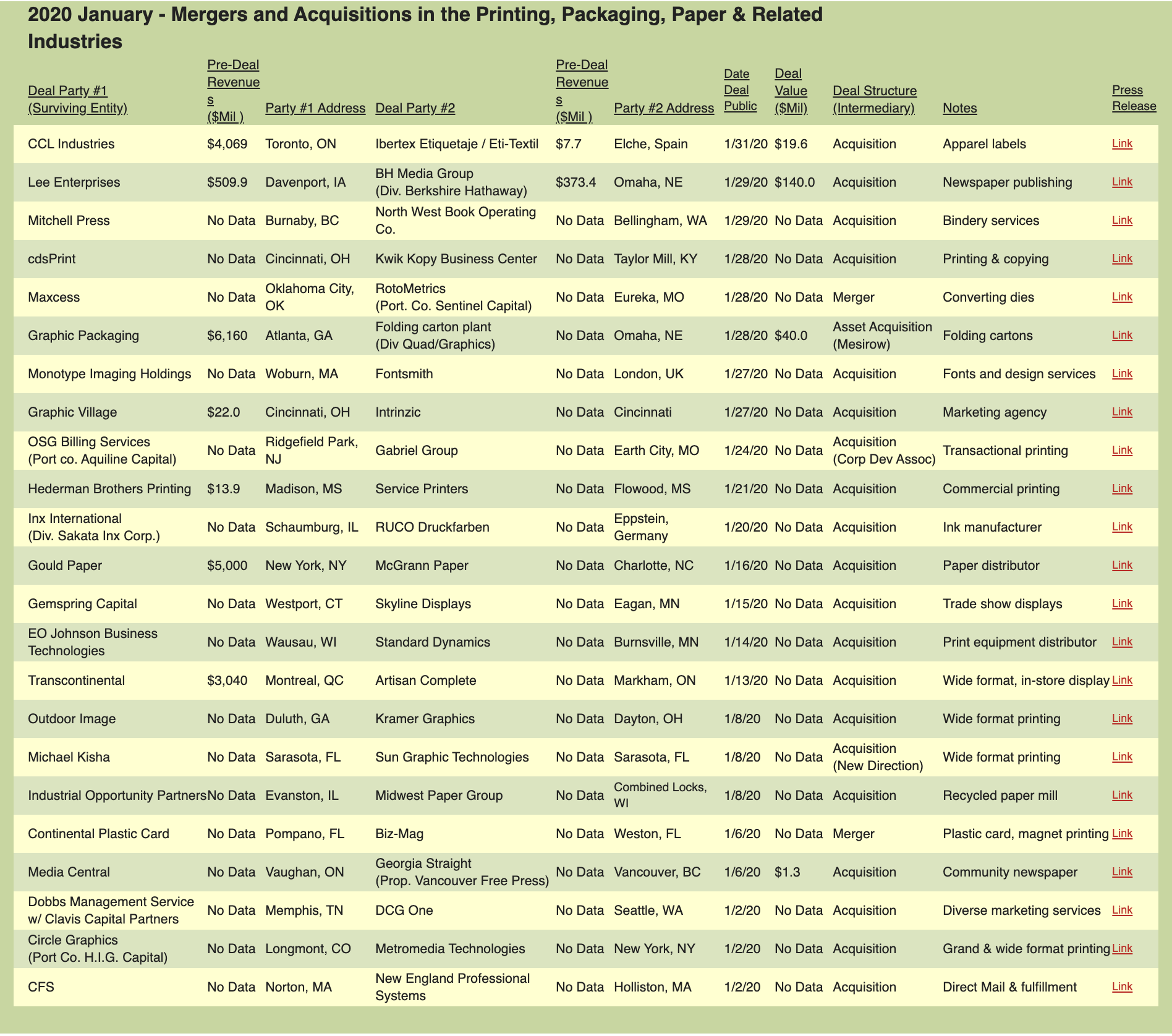 Graphic Village, based in Cincinnati, Ohio, is back on our deal log again. The company has grown strategically through acquisition; its latest move the purchase of Intrinzic which it identified as a “branding consultancy.” The acquired company provides brand concept development, design services, social media marketing, SEO, and other digital marketing services. Graphic Village has grown into a $22 million diverse graphic services company via serial acquisitions, including a folding carton manufacturer and a commercial printing company, both acquired in 2018. (See more about Graphic Village and links to other sources in The Target Report: September 2018).