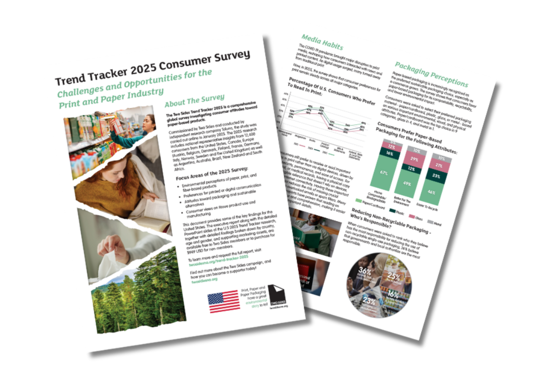As environmental awareness continues to shape consumer behavior, the NEW Two Sides' 2025 Trend Tracker survey reveals encouraging progress in consumer perceptions of print, paper, and paper-based packaging. Now available for the United States and Canadian markets, the survey points to increasing awareness of sustainability facts – and the essential role of paper in a circular economy.