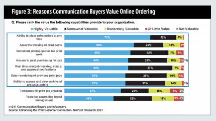 Communication buyers value many of the benefits W2P systems deliver. More than half of communication buyers participating in the same NAPCO Research survey value services that enable better management and visibility of their print orders and costs (Figure 3). Almost three-quarters (72%) report that placing print orders at any time is highly valuable. In addition, more than half deem real-time access to print job status, cost tracking, and price quotes as valuable to their organizations.