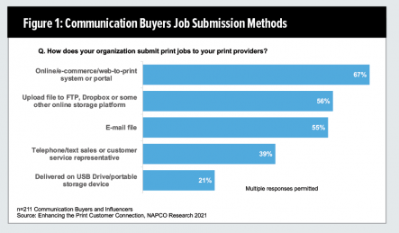 A NAPCO Research study (sponsored by Canon U.S.A.), titled “Enhancing the Print Customer Connection,” surveyed more than 200 communication buyers and influencers, and asked various questions on job submission and preferences. A key finding of this research is that communication buyers and influencers prefer —and use —a variety of options for submitting print work. As shown in Figure 1, two-thirds (67%) of communication buyers/influencers report using an online ordering system, and more than half upload files (56%) or email (55%) job files to print providers.