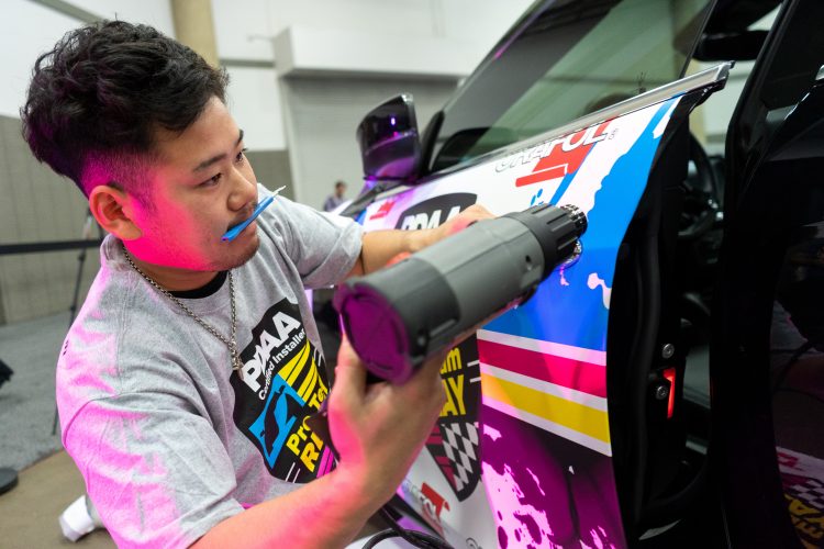 Keiichi Hasegawa, C17 Media (left), and teammate Blake Madsen, Remix Wraps, were first place winners in last month’s PDAA Pro Team Relay at PRINTING United 2019. The competition tested two-person teams in four graphics installation stations: a car’s quarter panel, rivet wall, a two-panel graphic on a rough texture surface, and two-color vinyl on acrylic.