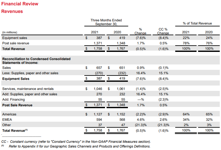During the third quarter 2021, our business continued to be impacted by the COVID-19 pandemic. The prolonged and extensive impact of the Delta variant drove many of our customers to delay their plans to return employees to offices. As a result, while we continued to see a correlation between the roll-out of vaccinations, the return of employees to the office, and the gradual recovery of our post sale revenues, the marginal improvement in our page volume-driven post sale revenues was less than previously anticipated. In addition, global supply chain issues, created in part by the COVID-19 pandemic, have resulted in an unprecedented level of disruption that has led to shortages and transportation delays of our products and third-party IT hardware. This has resulted in lower than anticipated equipment and IT sales, higher transportation and logistics costs and growth of our order backlog1 at the end of the quarter, as our customers continued to invest in our print technology and services. We expect the ongoing effects of the COVID-19 pandemic, including the potential emergence of new variants, as well as the global supply chain disruption, to delay economic recovery and continue to affect our revenues and margins into 2022.