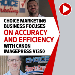 Choice Marketing’s business focuses mainly on trading cards, which means registration, color accuracy, and repeatability are extremely important. Learn more about how Choice Marketing is leveraging the Canon imagePRESS V1350 in their shop to provide their customers with faster turnaround times, wider media range, and precise registration and color management.