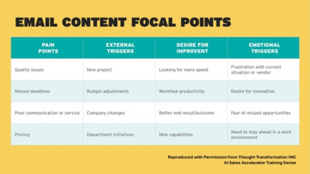 It's difficult to pinpoint the hot button that motivates a single buyer to act. However, you can uncover patterns and understand what resonates with buyers as a group. To help with that, I’ve included a chart from Thought Transformation’s AI Sales Accelerator training. It highlights common pain points, external and emotional triggers, and buyers' reasons for seeking improvement.